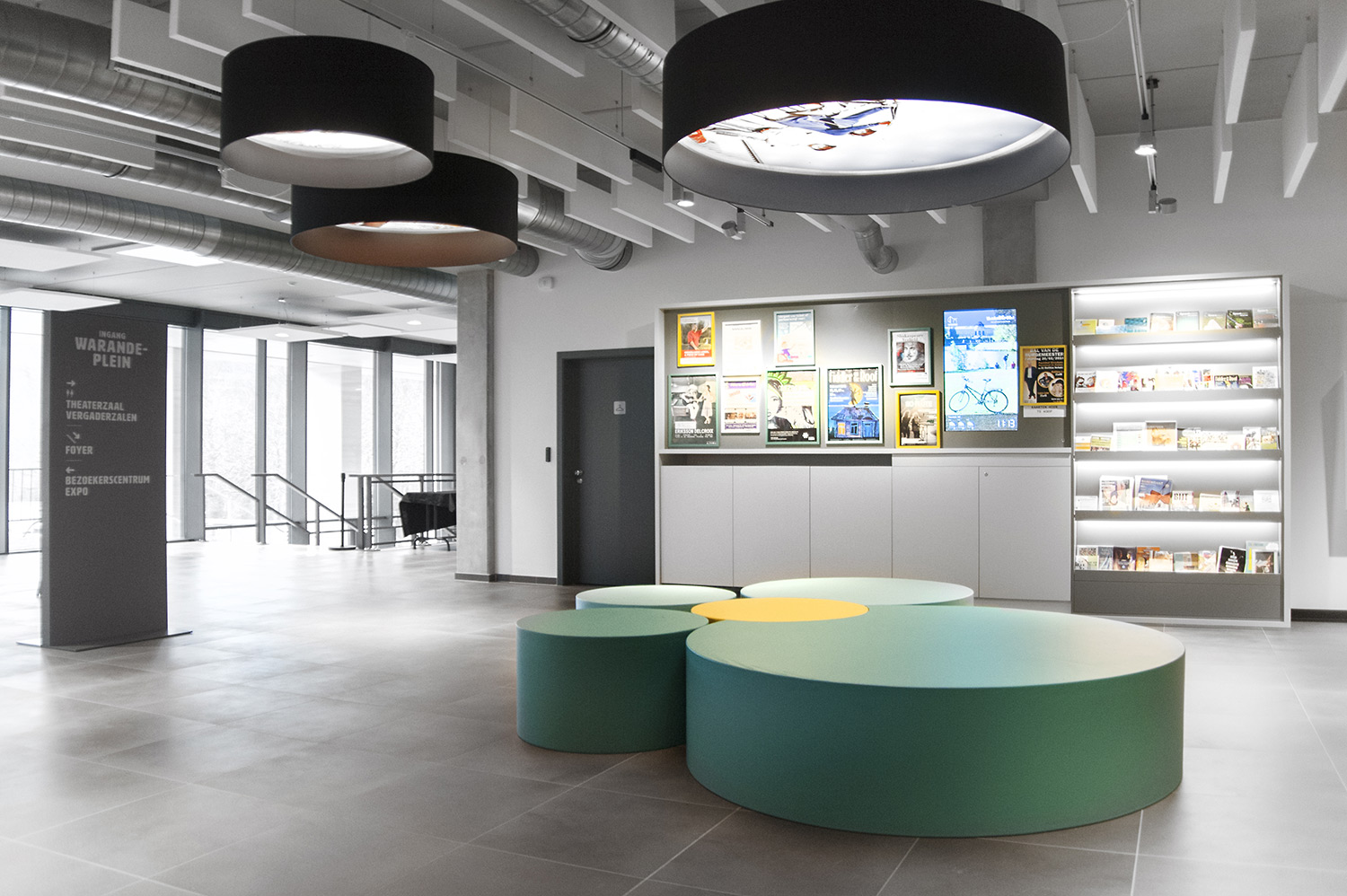 Het nieuwe vrijetijdscentrum De Warande geeft onderdak aan de theaterzaal, de toeristische dienst en de bibliotheek. Het gebouw nestelt zich tussen de prachtige vijvers van het Warandepark en het bruisende centrum. In overleg met de gemeentelijke architect Nick Janssens, het adviesbureau Landmark en de ervaren bibliothecaris Herman de Meulemeester hebben we een inrichting ontworpen met vooral nadruk op een heldere presentatie van een beperkter, maar aantrekkelijk aanbod.