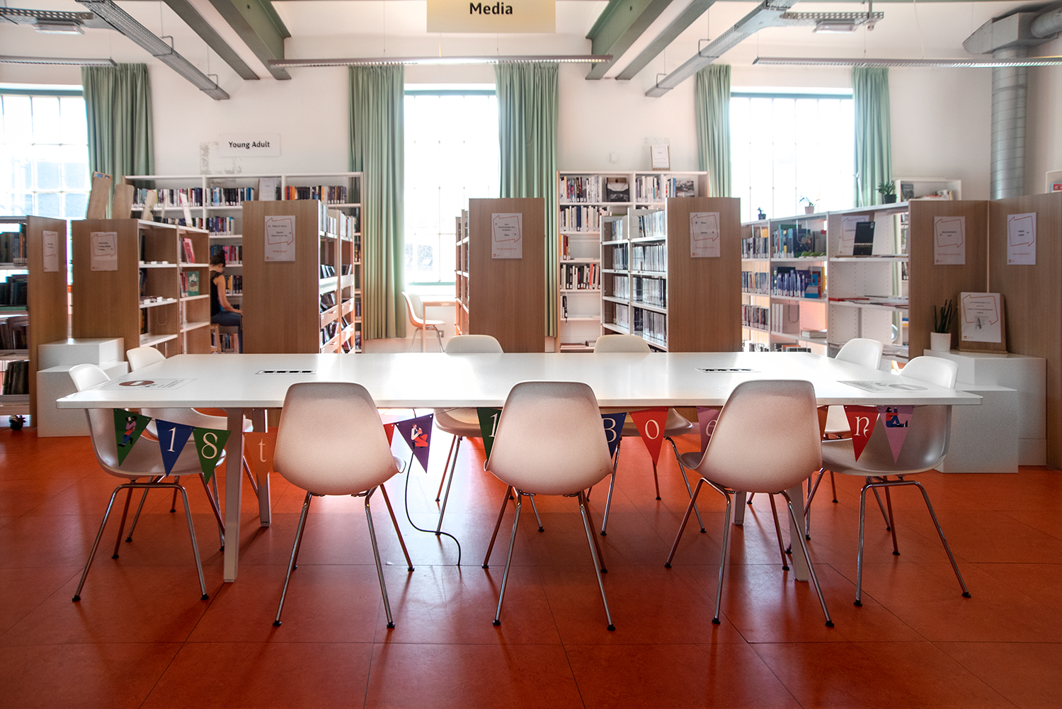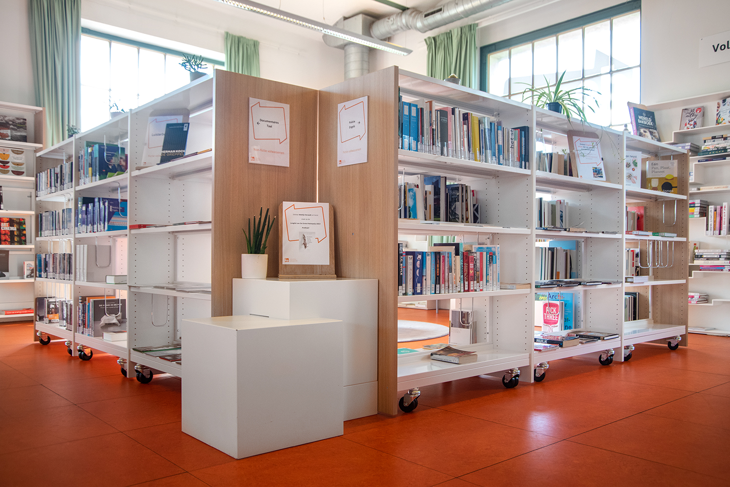 Bibliothecaris Elise Ghyselen: “Onze bibliotheek is een echte familiebib. Het was dus vooral belangrijk dat de inrichting werd afgestemd op ons jong en divers publiek, en anderstalige leners. Duidelijke en visueel toegankelijke signalisatie was essentieel.”