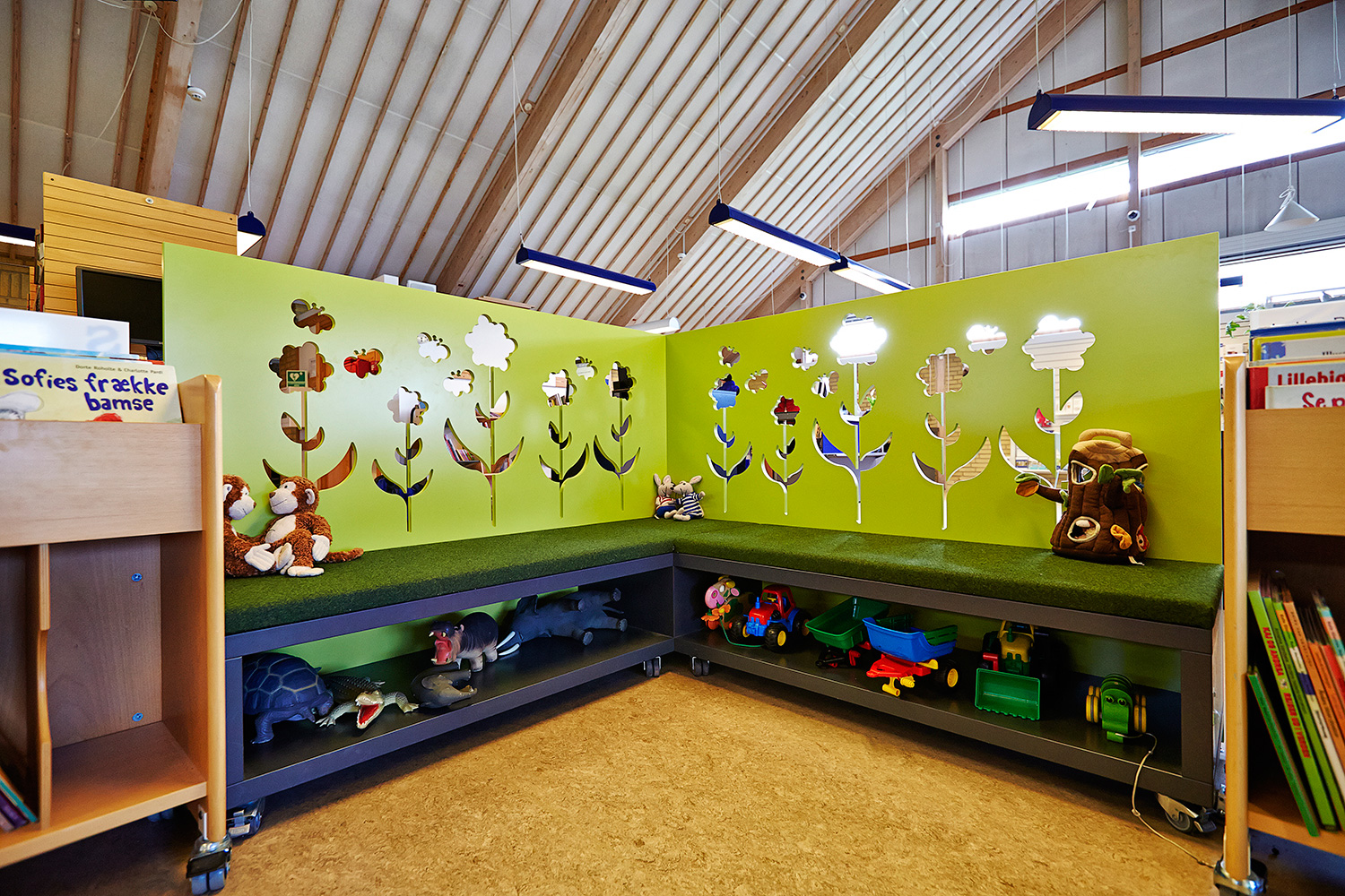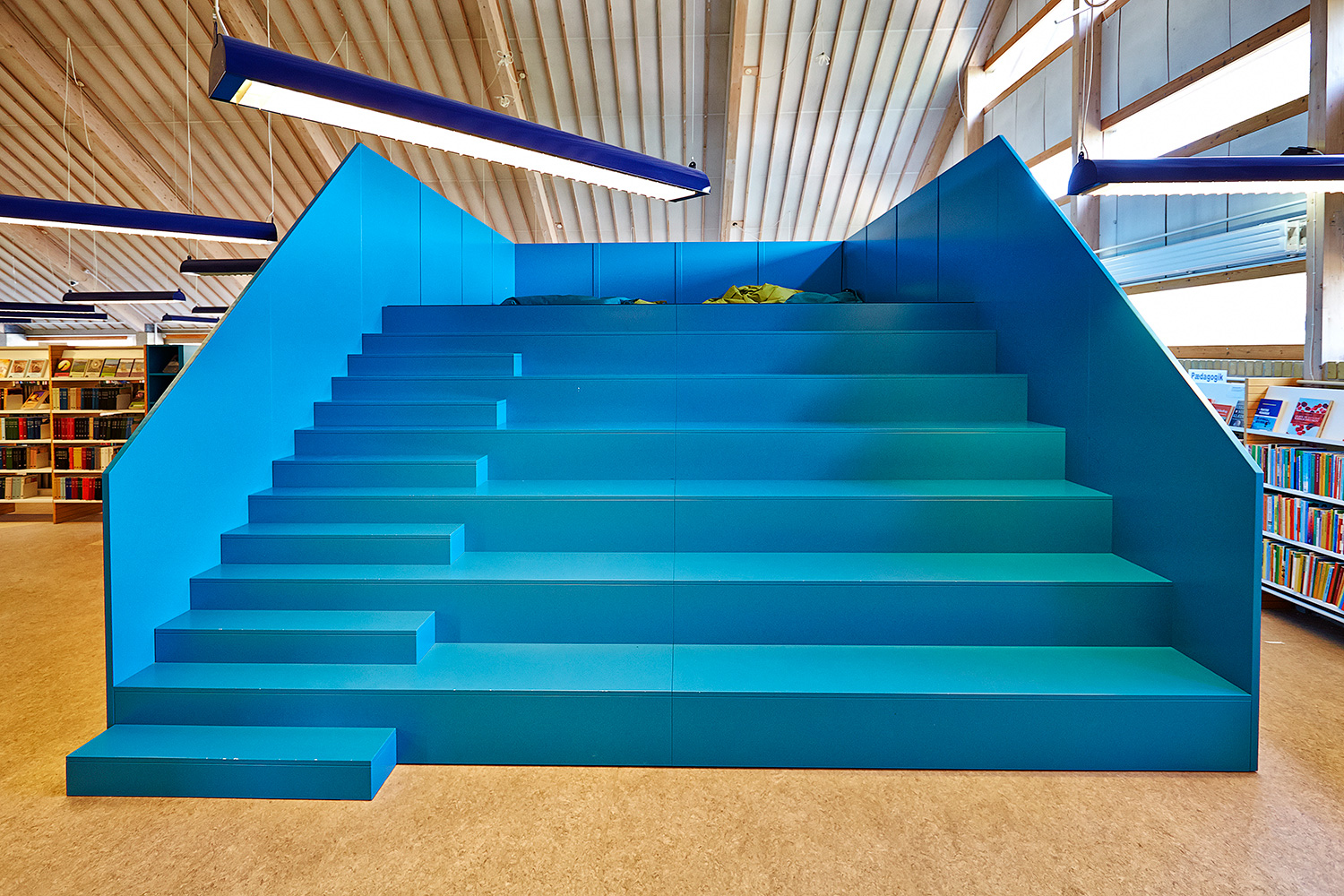 Eén van deze op maat gemaakte meubelen is een mooi en multifunctioneel trapmeubel. Het meubilair bestaat uit een ruimte waar u een goed boek kan lezen, een brede trap waar u kunt zitten en lezen, en een platform, waar u kunt ontspannen in een zitzak. Met zijn gesleufde buitenkant fungeert hij ook als een boekentoren. Ook het gedeelte voor de kinderen heeft aangepast meubilair.