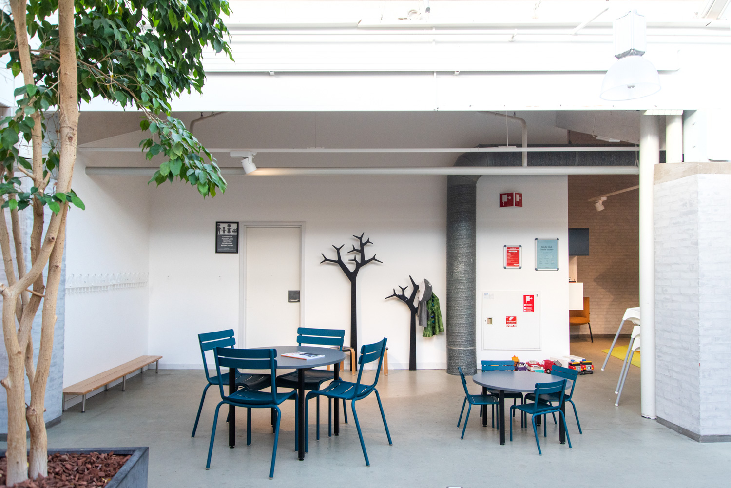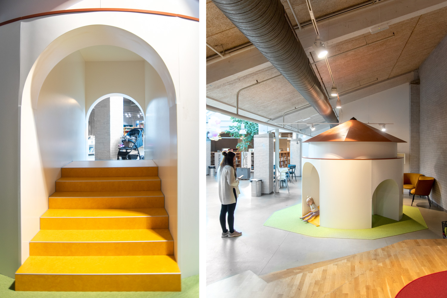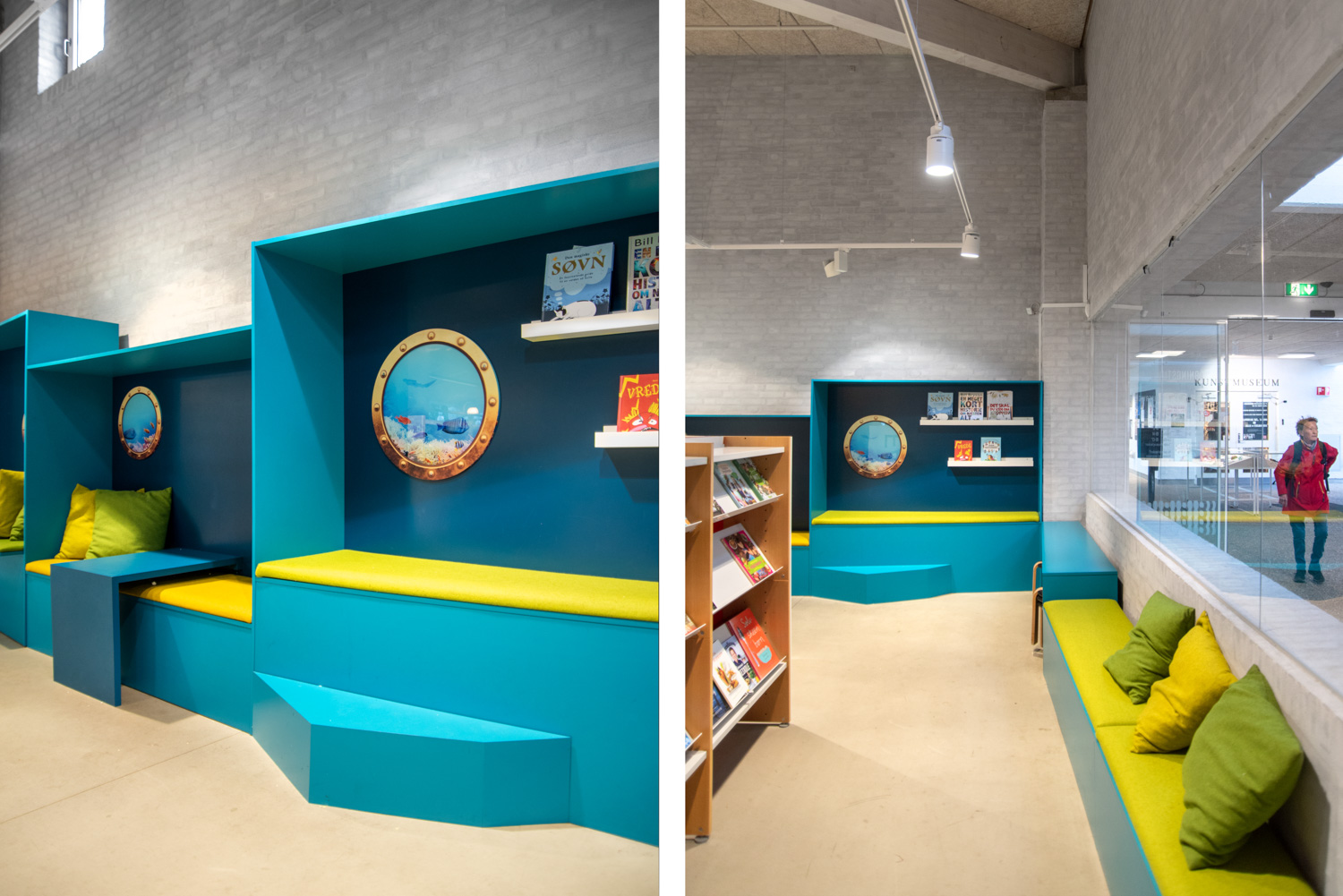 Voor de kleinere kinderen lag de focus op een speelhoek die ook uitnodigend was voor de ouders. Een miniatuurversie van de Krudttårnet, de oude buskruittoren die nog in het stadje te zien is, biedt de kinderen heel wat klim- en glijplezier, terwijl ze zich in de turquoise leesgrotten met patrijspoorten diep in de zee wanen. Ondertussen kunnen ouders en grootouders zich ontspannen en een oogje in het zeil houden vanuit het diverse loungemeubilair. Verder kreeg de bib nog nieuwe tafels en een garderobe.