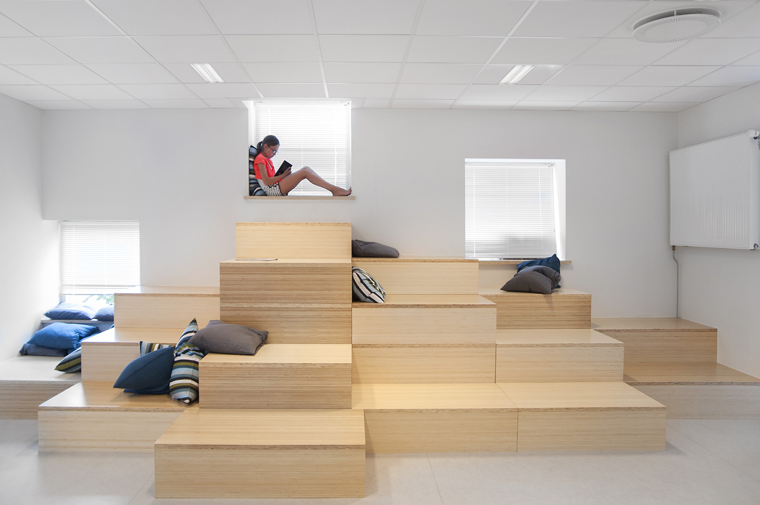 Het interieurontwerp biedt veel mogelijkheden aan voor zowel de studenten als de inwoners van de stad die de bibliotheek gebruiken als werkplek of als een tweede thuis waar ze geïnspireerd worden door de presentatiepanelen en de veranderende tentoonstelling in de bibliotheek.