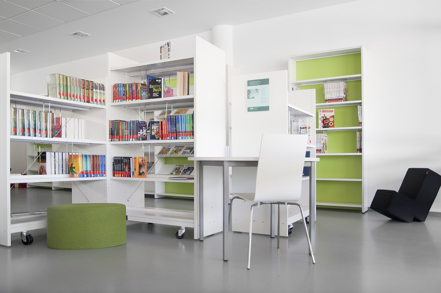 Aan de rand van de mooie wijk Edigheim deel van de stad Ludwigshafen, kan u deze creatieve en vooruitstrevende onderwijsinstelling met zijn bibliotheek terug vinden. Deze moderne en multifunctionele bibliotheek zit voordevol onconventionele ideeën. Het groen-witte interieur zorgt voor een natuurlijke en frisse sfeer en sluit mooi aan bij de aangrezende tuin.
