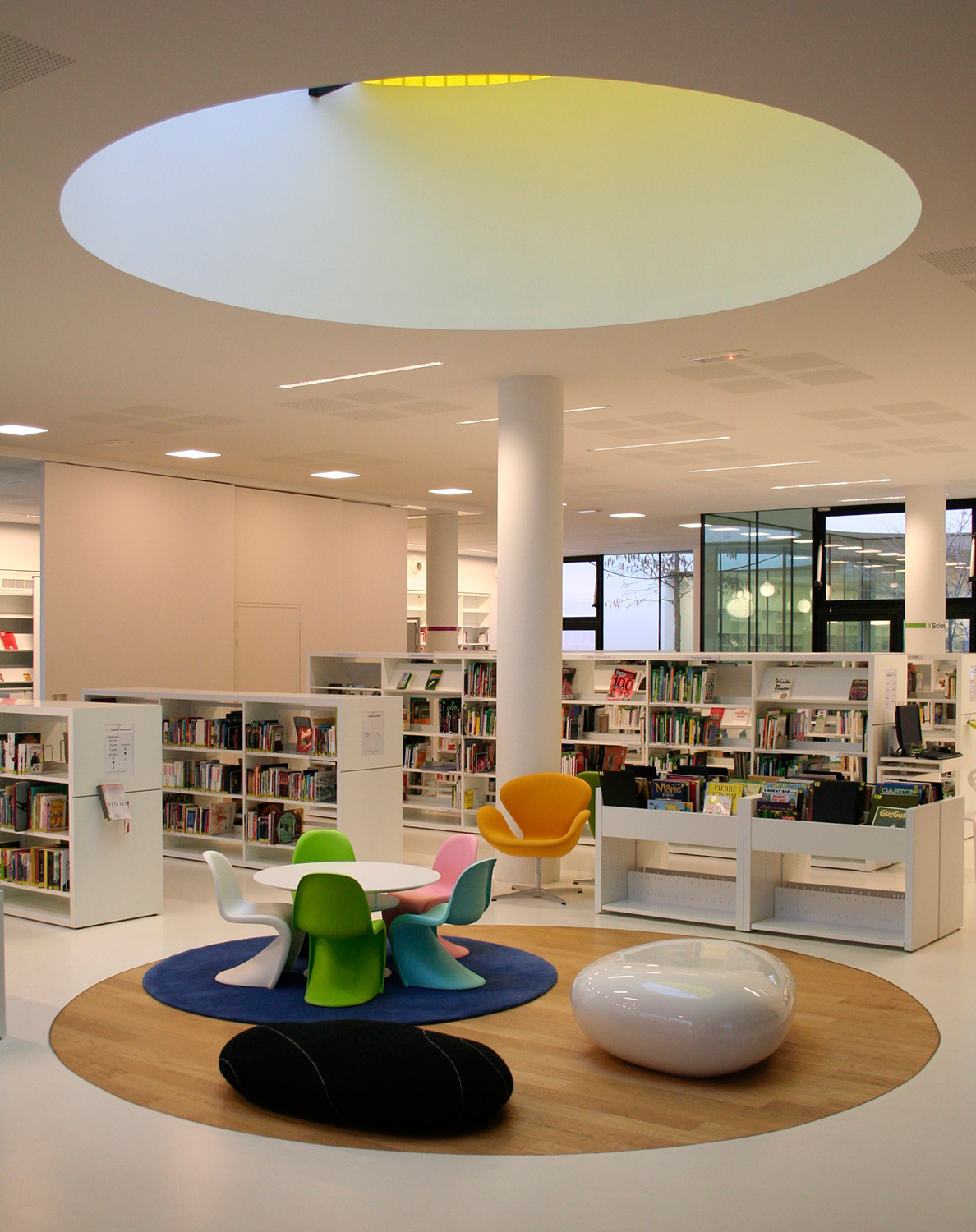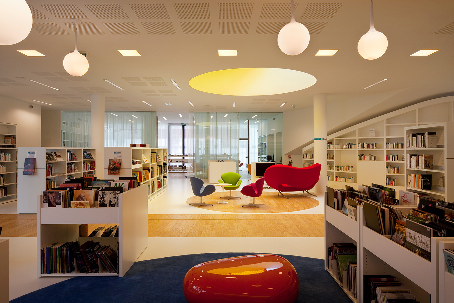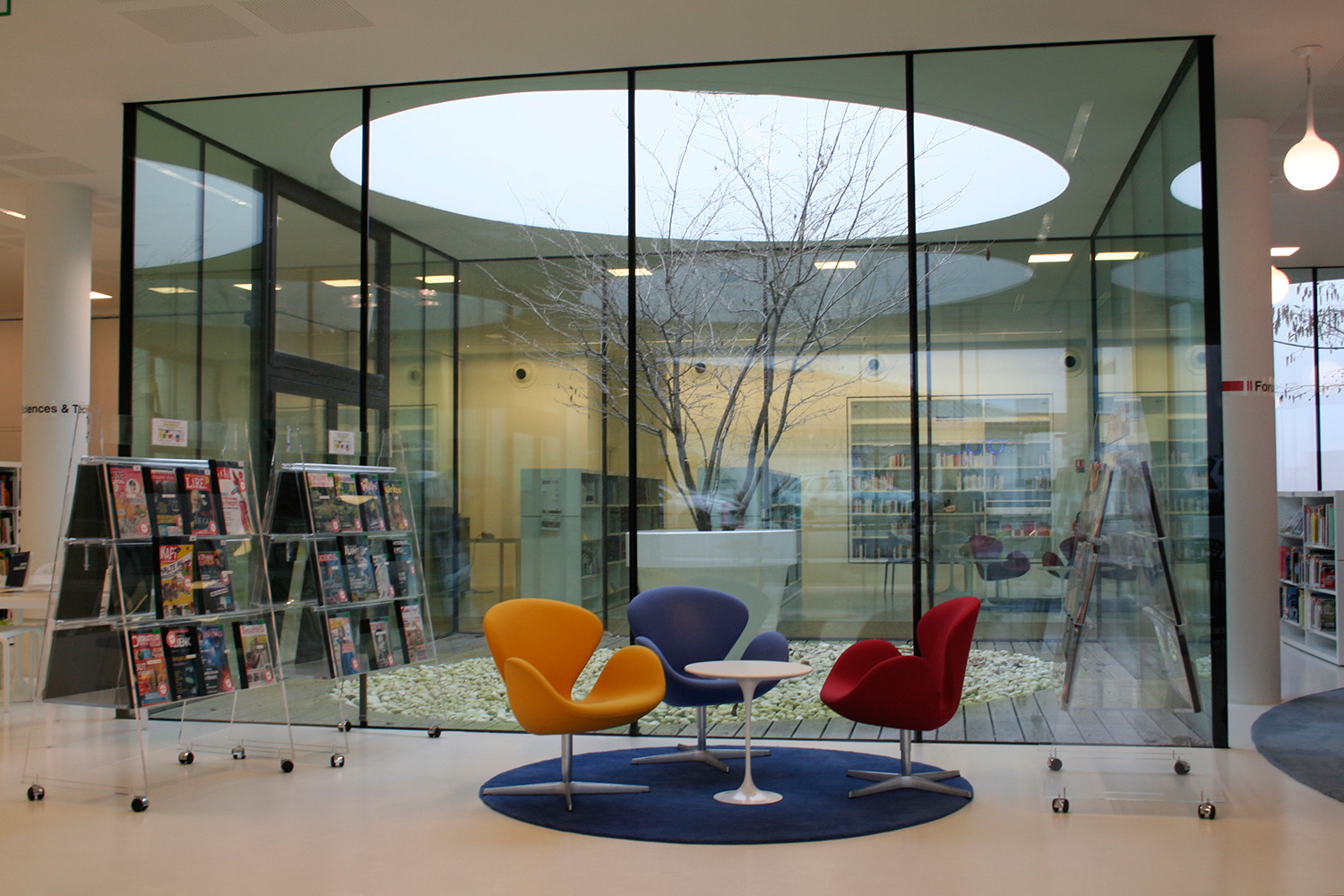 Als gevolg van het feit dat het gebouw op een helling werd geplaatst, hebben de architecten de buitenkant van het gebouw voorzien van grote raampartijen waardoor de lichtinval optimaal is. Het interieur van de bibliotheek is overwegend wit, met een lijn van eik in de vloer doorheen de hele bibliotheek. Alleen de zitplaatsen en een paar tapijten brengen een vleugje kleur aan het interieur.
