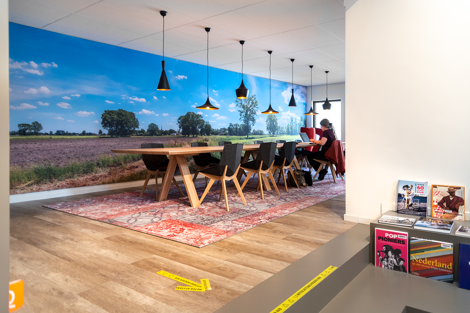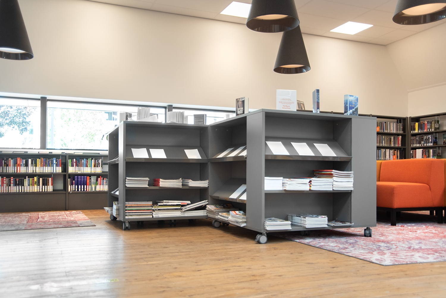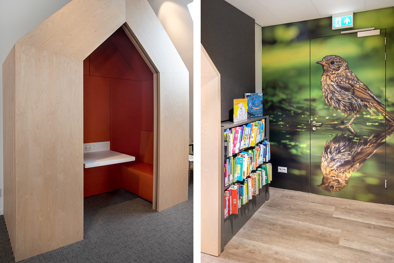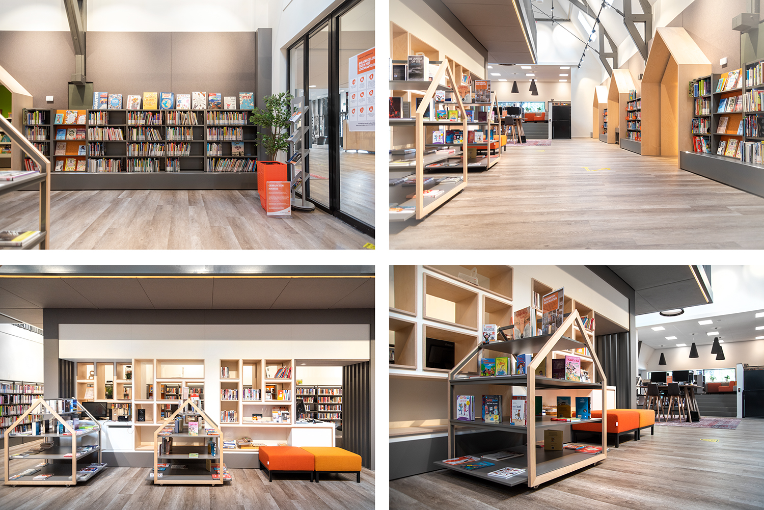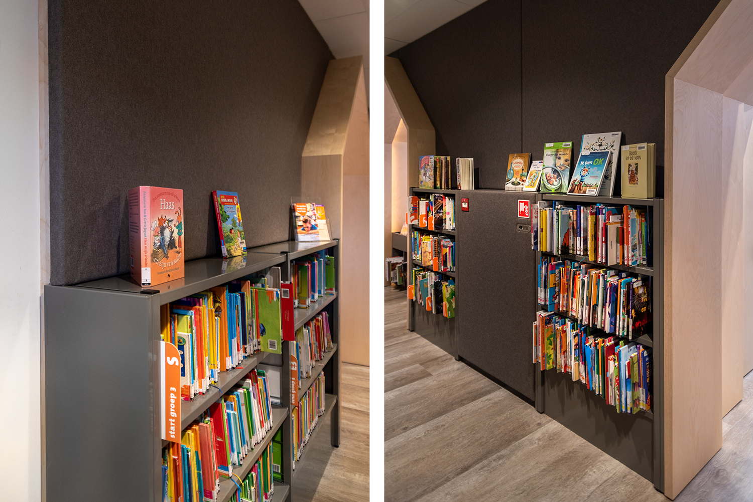 De bibliotheekruimte is open en ingericht met verschillende natuurlijke materialen wat de ruimte een zacht en toegankelijk karakter geeft. Het meubilair is volledig op elkaar afgestemd. Maatwerken en bibliotheekrekken lopen visueel vloeiend in elkaar over.