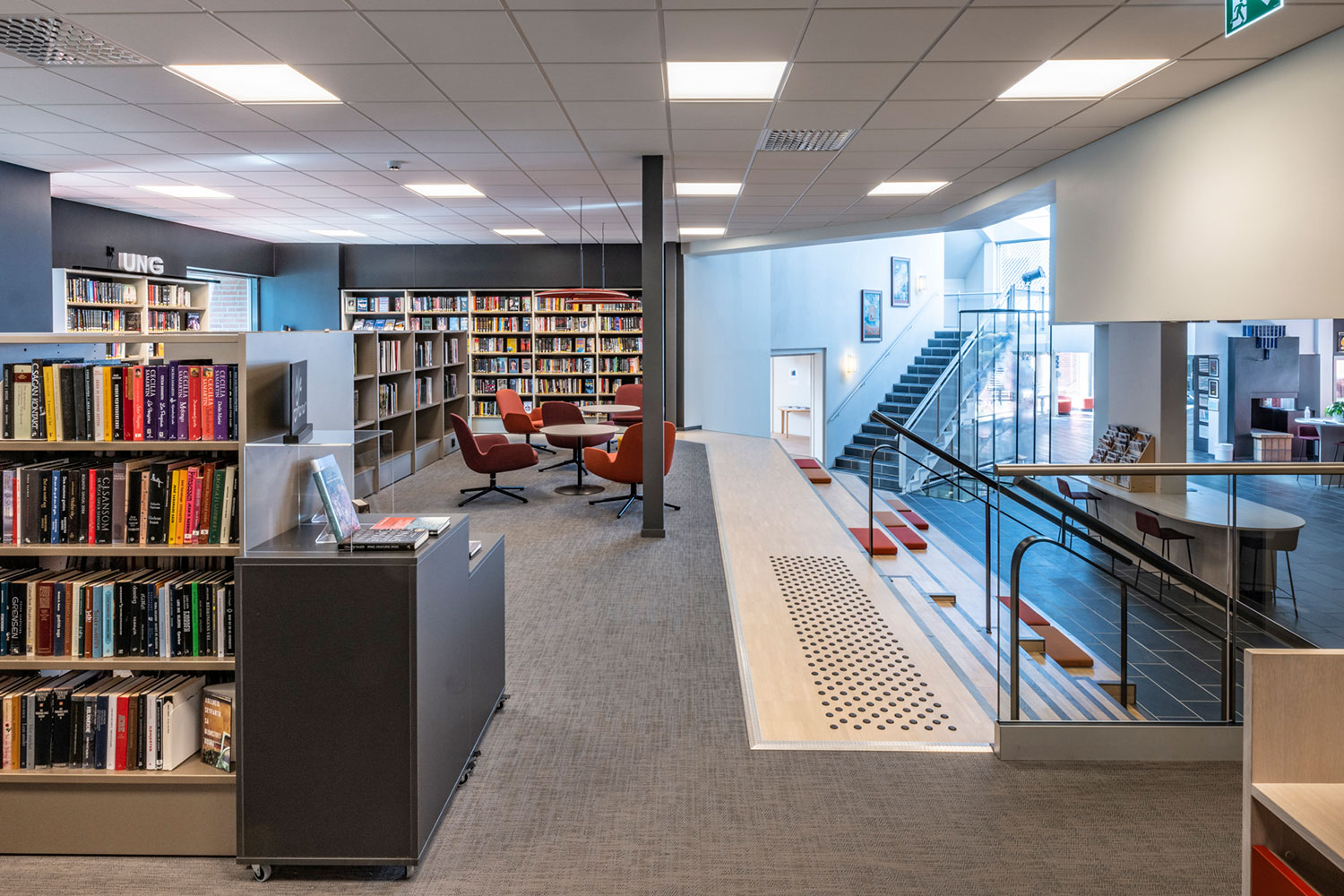 Het amfitheater is het verzamelpunt van het cultuurhuis en ideaal voor allerlei activiteiten zoals informele ontmoetingen, als podium of als zitgelegenheid. Het biedt een mooi uitzicht op het nabijgelegen platteland, en tegelijk op de vele activiteiten die in de bibliotheek plaatsvinden.