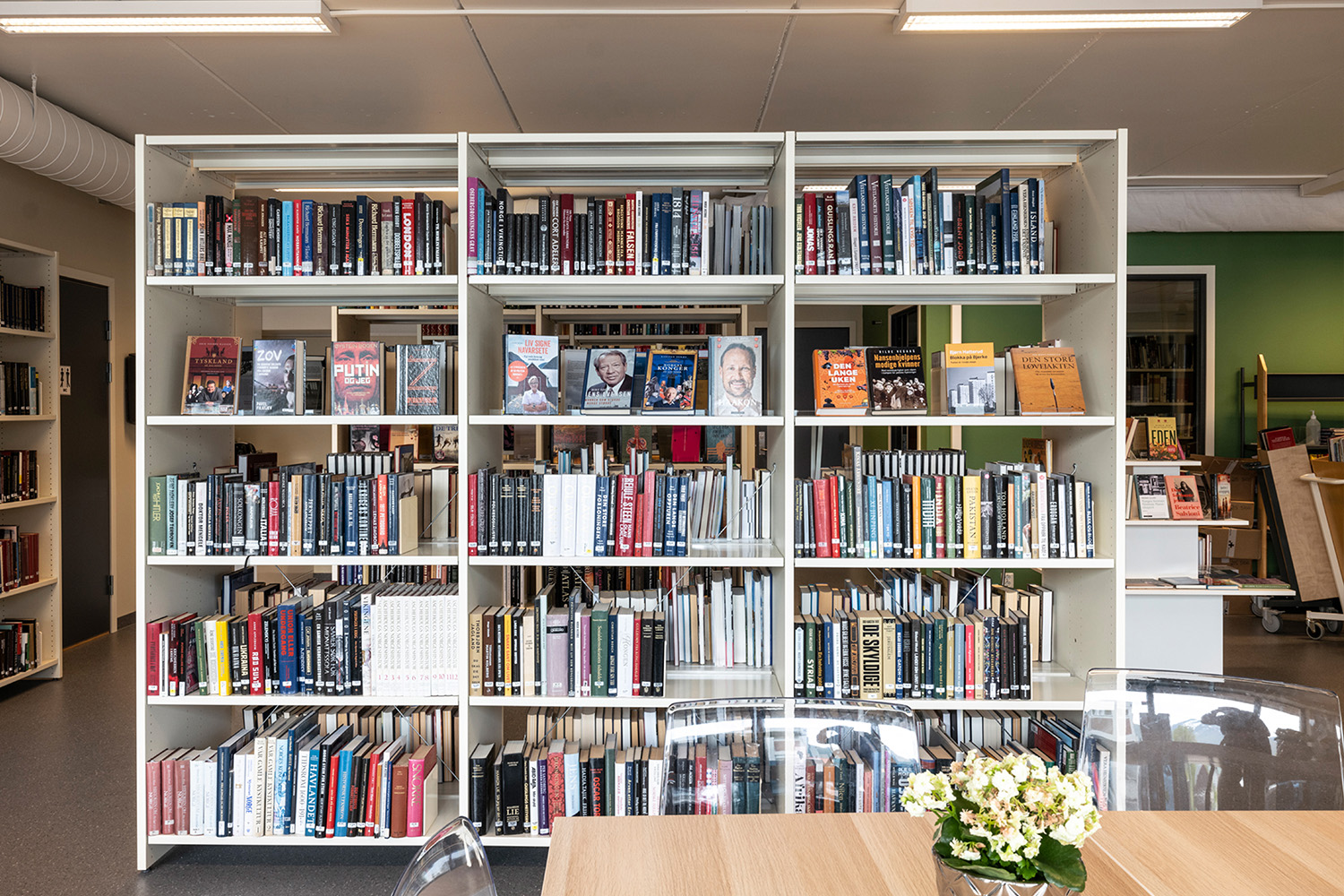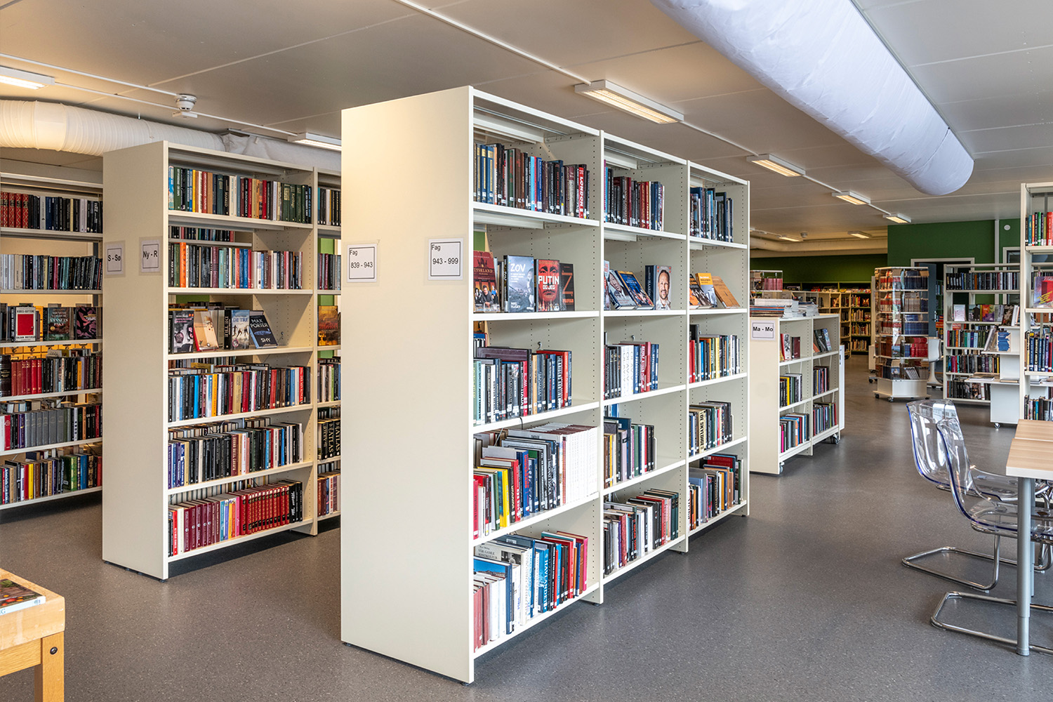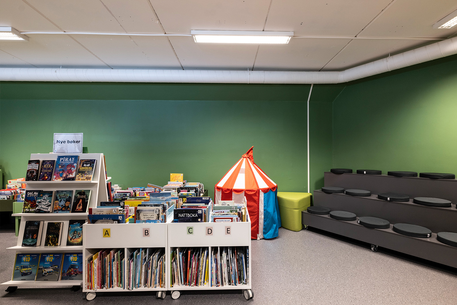 De bibliotheek streefde naar een harmonieuze mix van nieuwe, functionele legborden en infobalies, aangevuld met het hergebruik van bestaand meubilair en boekdisplays. Ons Noorse ontwerpteam BS Eurobib was verantwoordelijk voor de lay-out en kleurenschema's en werkte samen met een dealer voor de aanlevering van rekkensystemen, balies, displaytorens, boekentrolleys en meer.