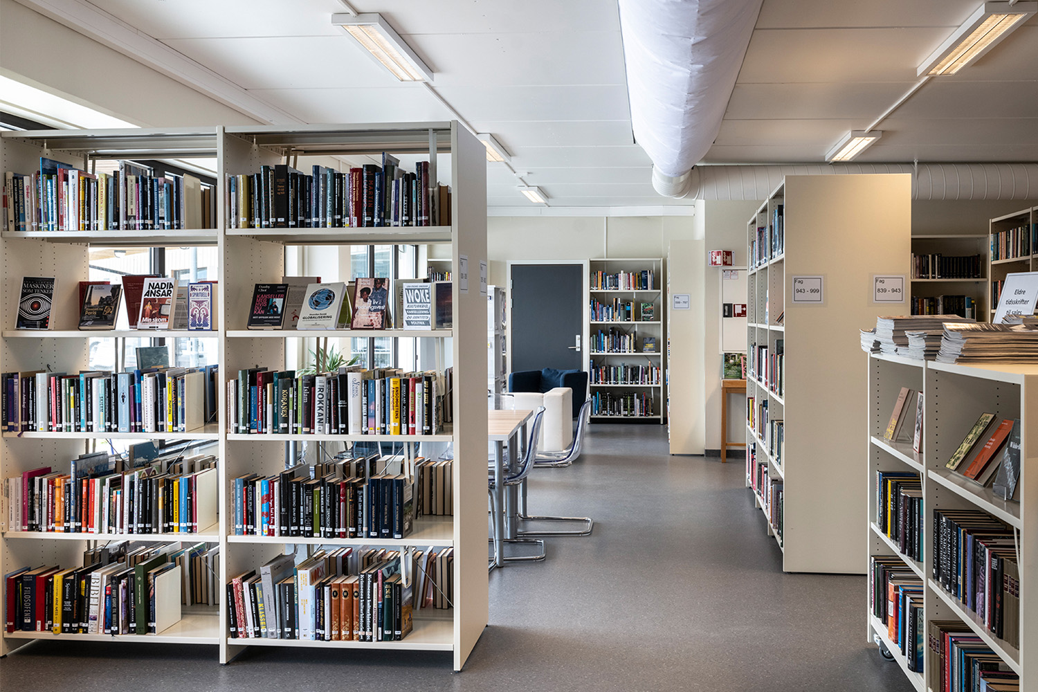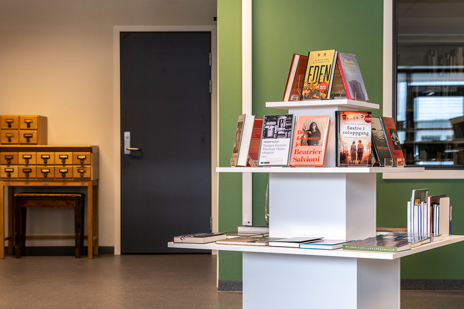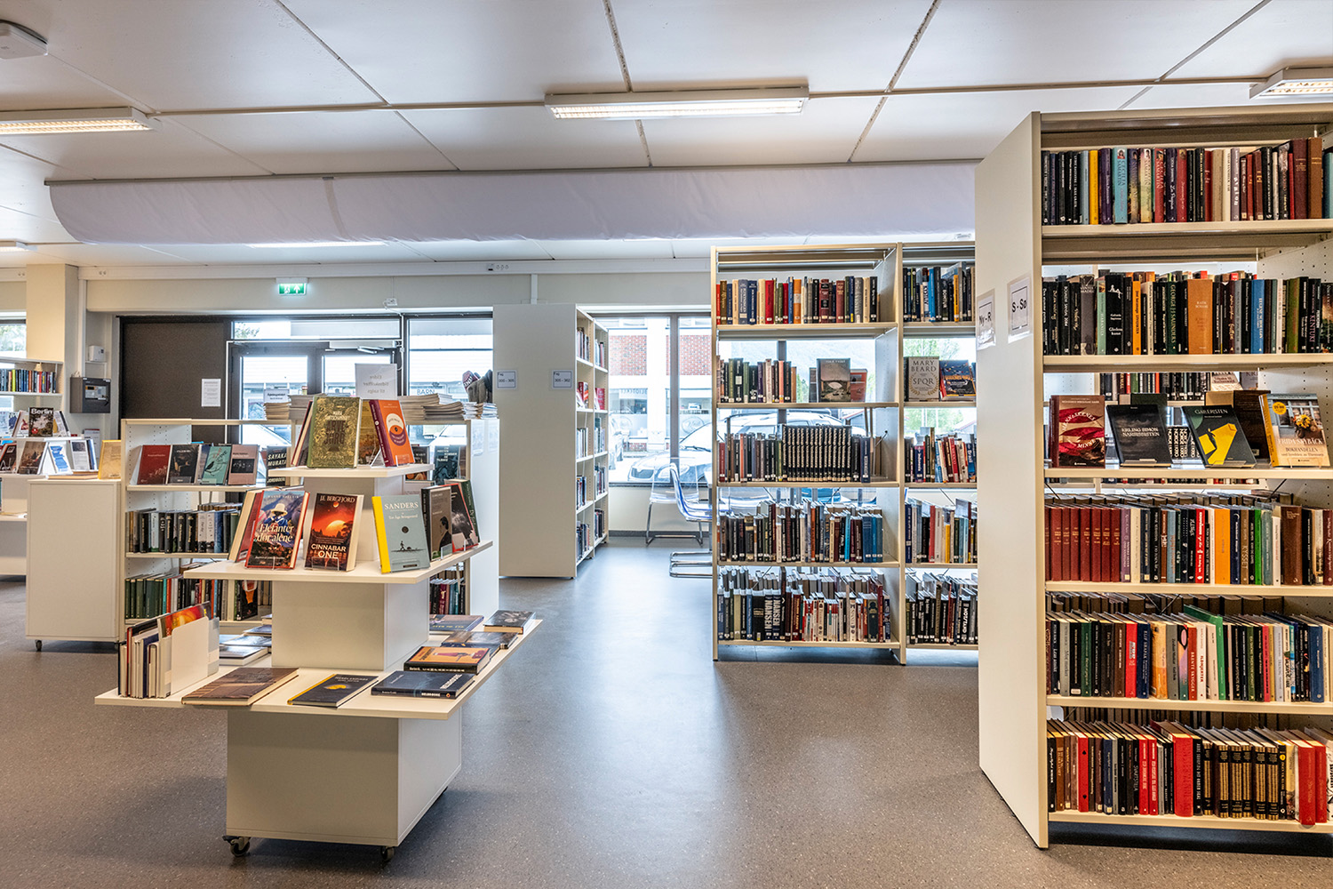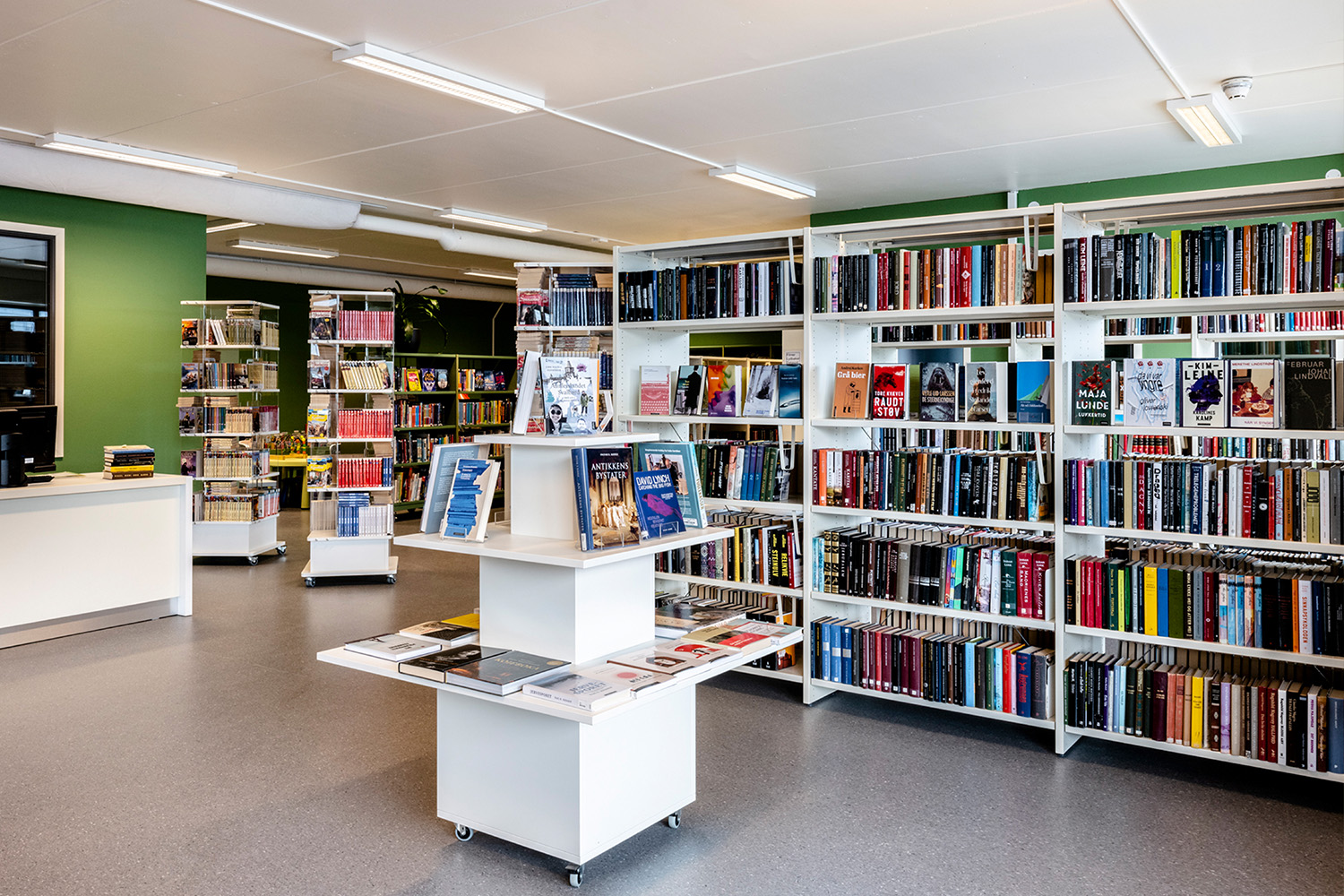 De bibliotheek streefde naar een harmonieuze mix van nieuwe, functionele legborden en infobalies, aangevuld met het hergebruik van bestaand meubilair en boekdisplays. Ons Noorse ontwerpteam BS Eurobib was verantwoordelijk voor de lay-out en kleurenschema's en werkte samen met een dealer voor de aanlevering van rekkensystemen, balies, displaytorens, boekentrolleys en meer.