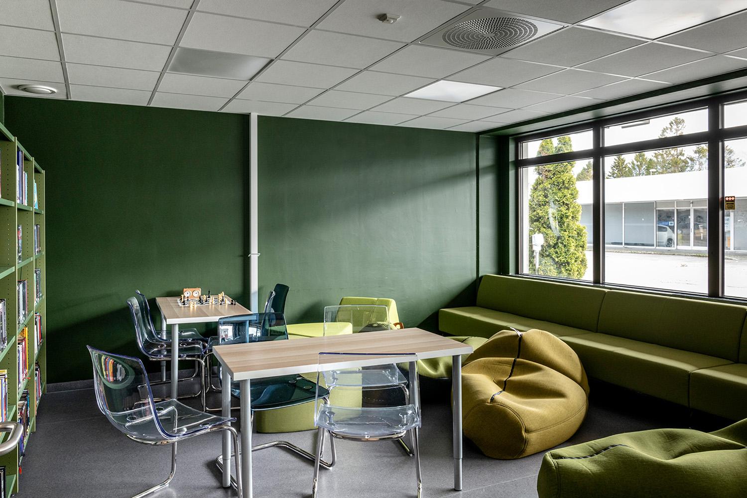 In de herfst van 2022 werd de gerenoveerde bibliotheek in Hustadvika, Eide, heropend met een combinatie van nieuwe rekken en hergebruikt meubilair. De bibliotheek heeft levendige kleuren en een open, lichtrijke omgeving dankzij de grote ramen en het lichtkleurige meubilair.