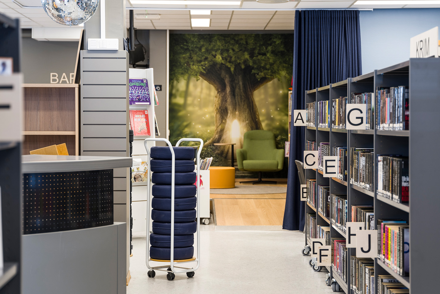 Achterin de kinderafdeling heeft de bibliotheek een eigen magisch bos gecreëerd. Met wanddecoraties en een ingebouwd podium is de ruimte de perfecte plek geworden voor het vertellen van verhaaltjes, toneelspelen en andere activiteiten. Dankzij de verplaatsbare rekken en zachte poefs kan de ruimte gemakkelijk worden omgevormd – van een sprookjesbos tot een leeshoek of cultureel podium – afhankelijk van de behoefte.