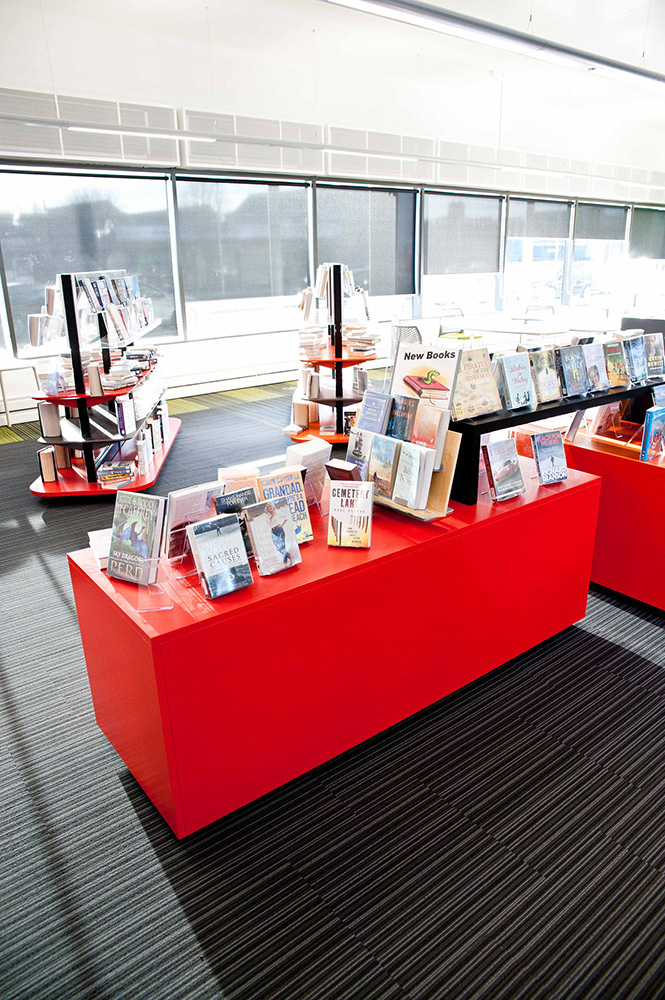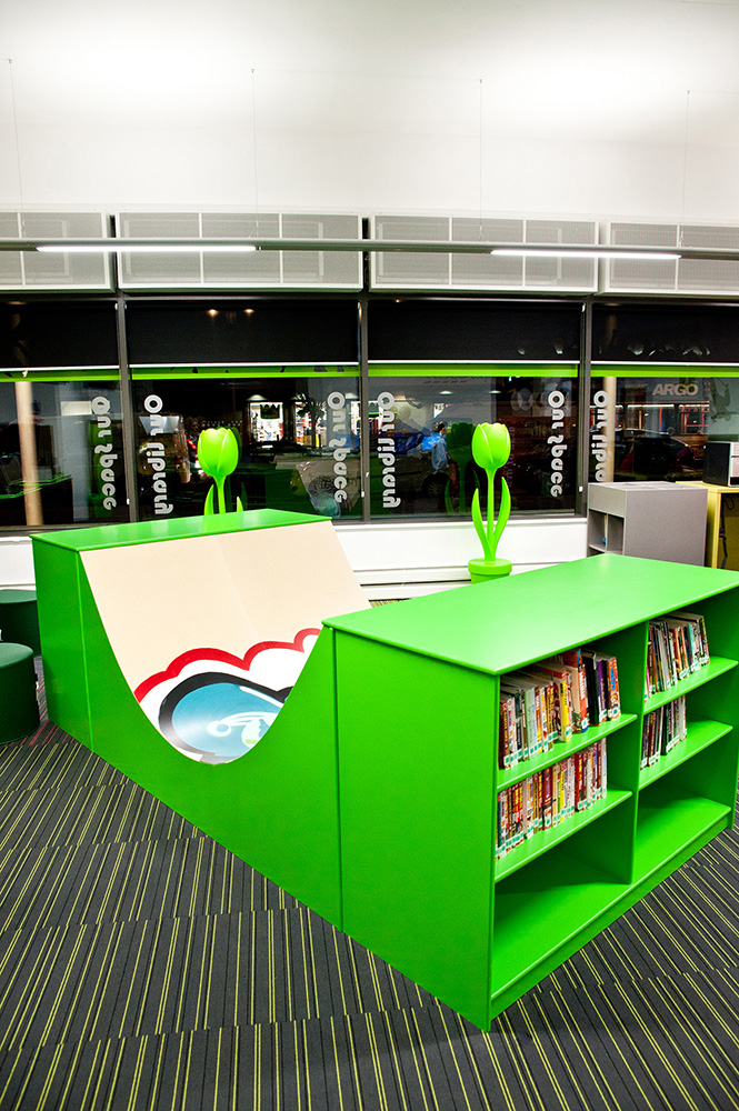 De kleurrijke jeugdafdeling, die 2/3e van de totale ruimte in beslag neemt, benadrukt het belang van de bibliotheek voor de toekomstige volwassenen.