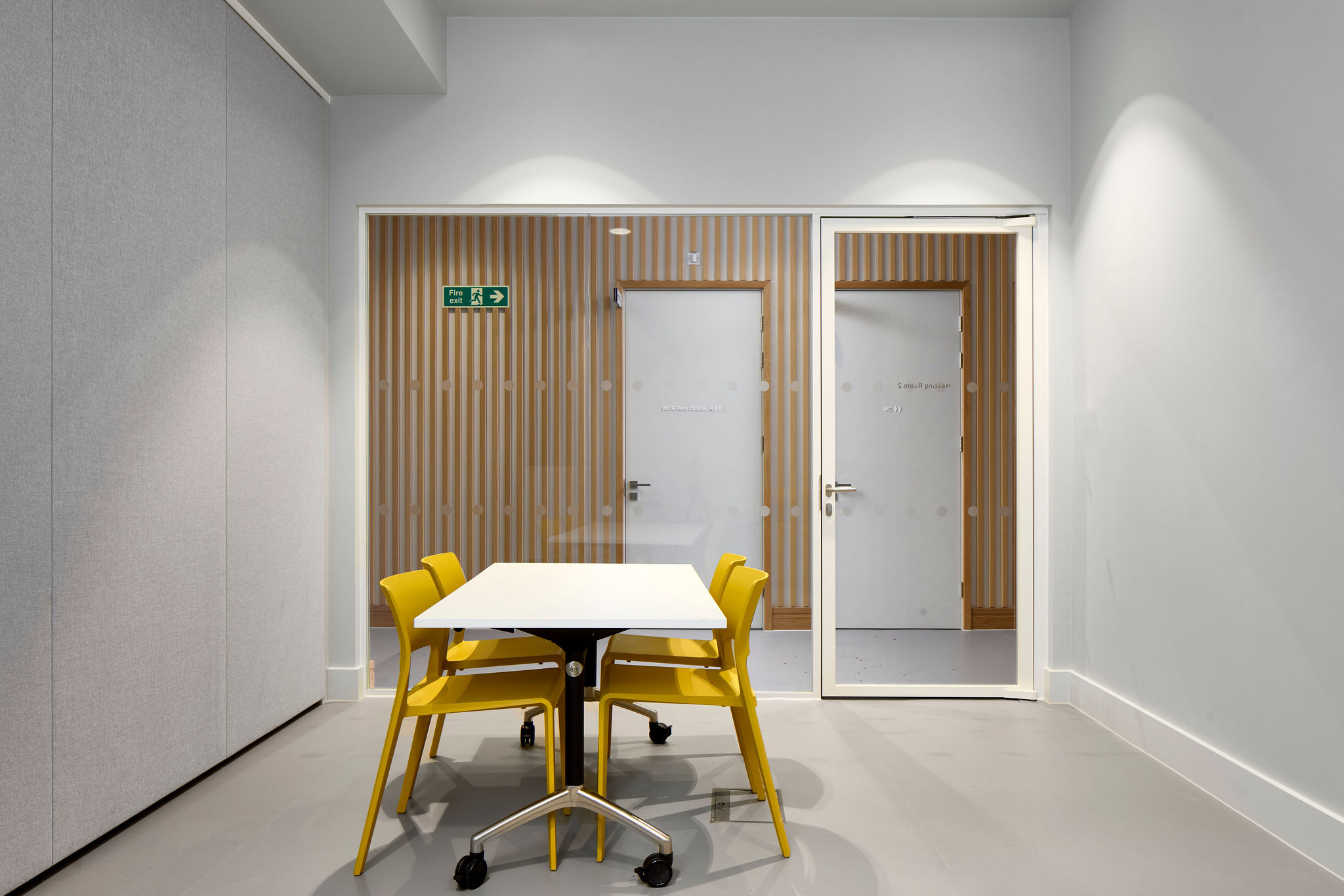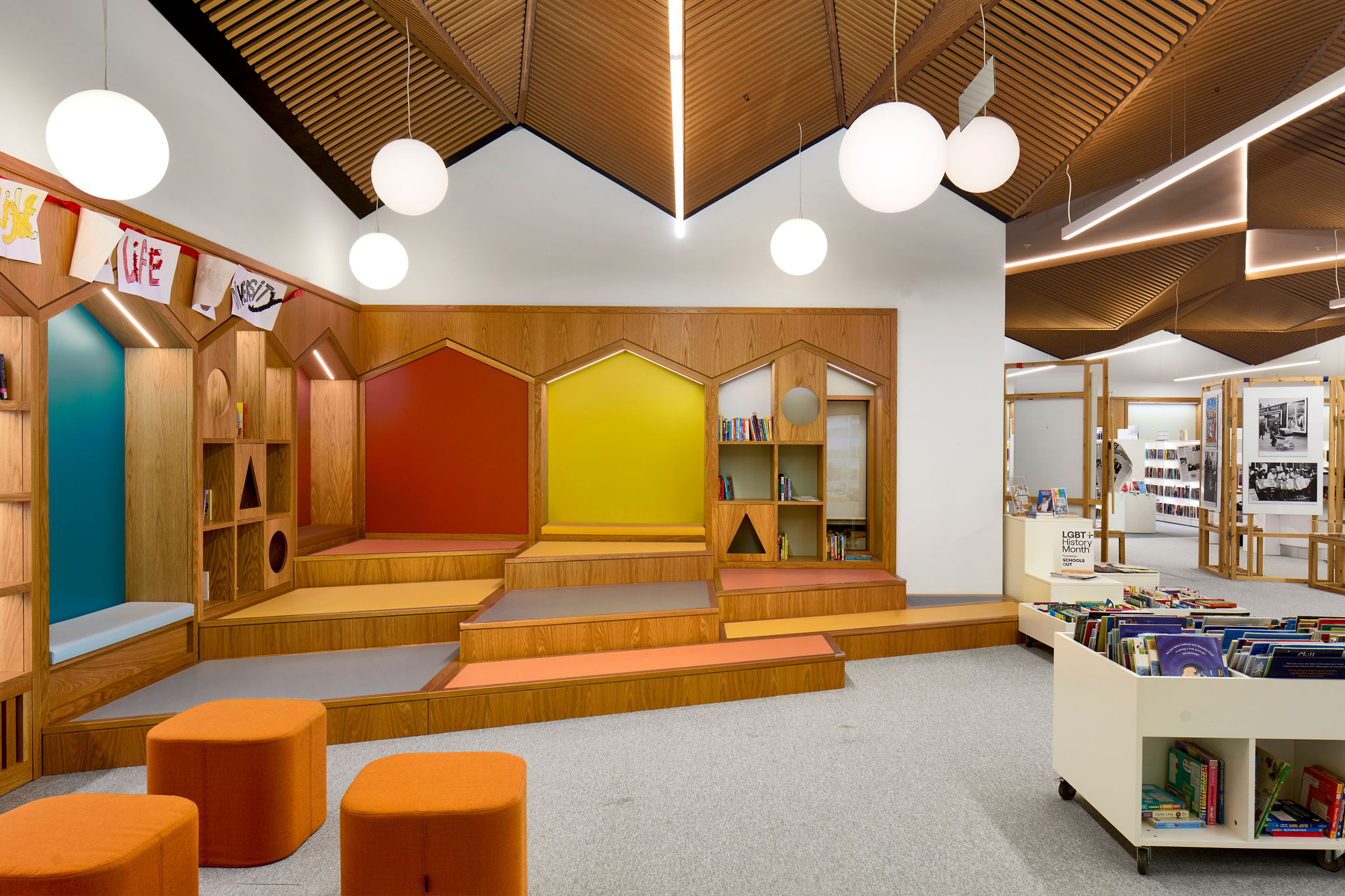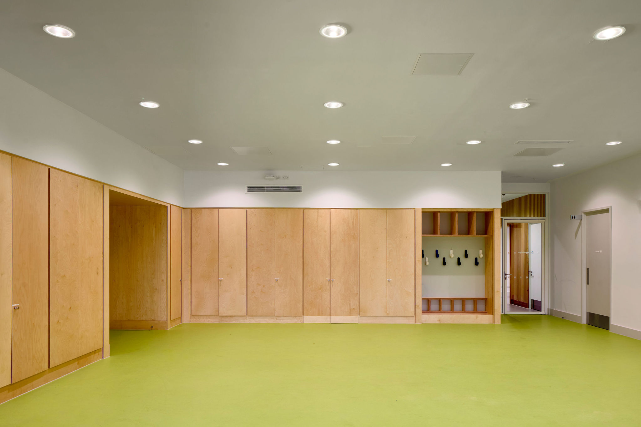 De polyvalente ruimte heeft een duurzame, waterbestendige vloer en houten lambrisering. De multifunctionele ruimte en vergaderzalen zijn allen uitgerust met projectiefaciliteiten en komen via schuifdeuren direct uit in de kinderbibliotheek.