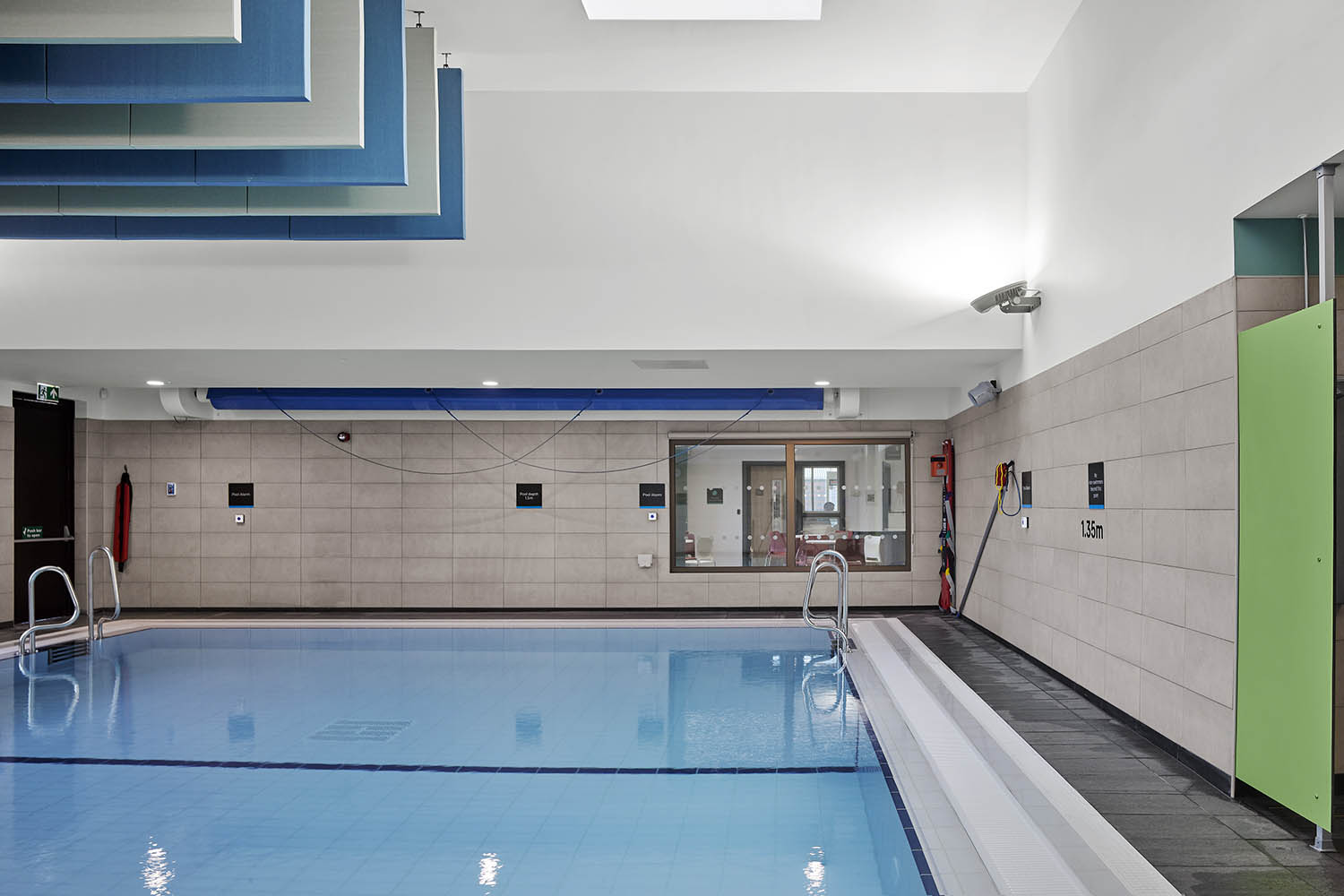 Het gebouw telt drie bouwlagen, met op het gelijkvloers een trainings- en therapiebad en een gemeenschapszaal met bibliotheekdiensten en digibar.