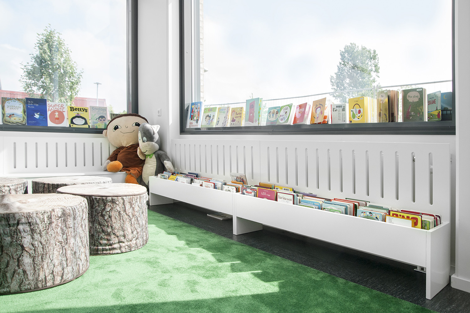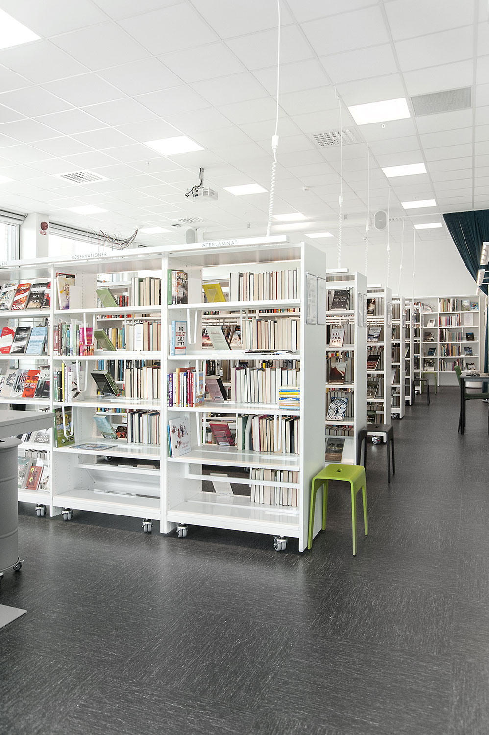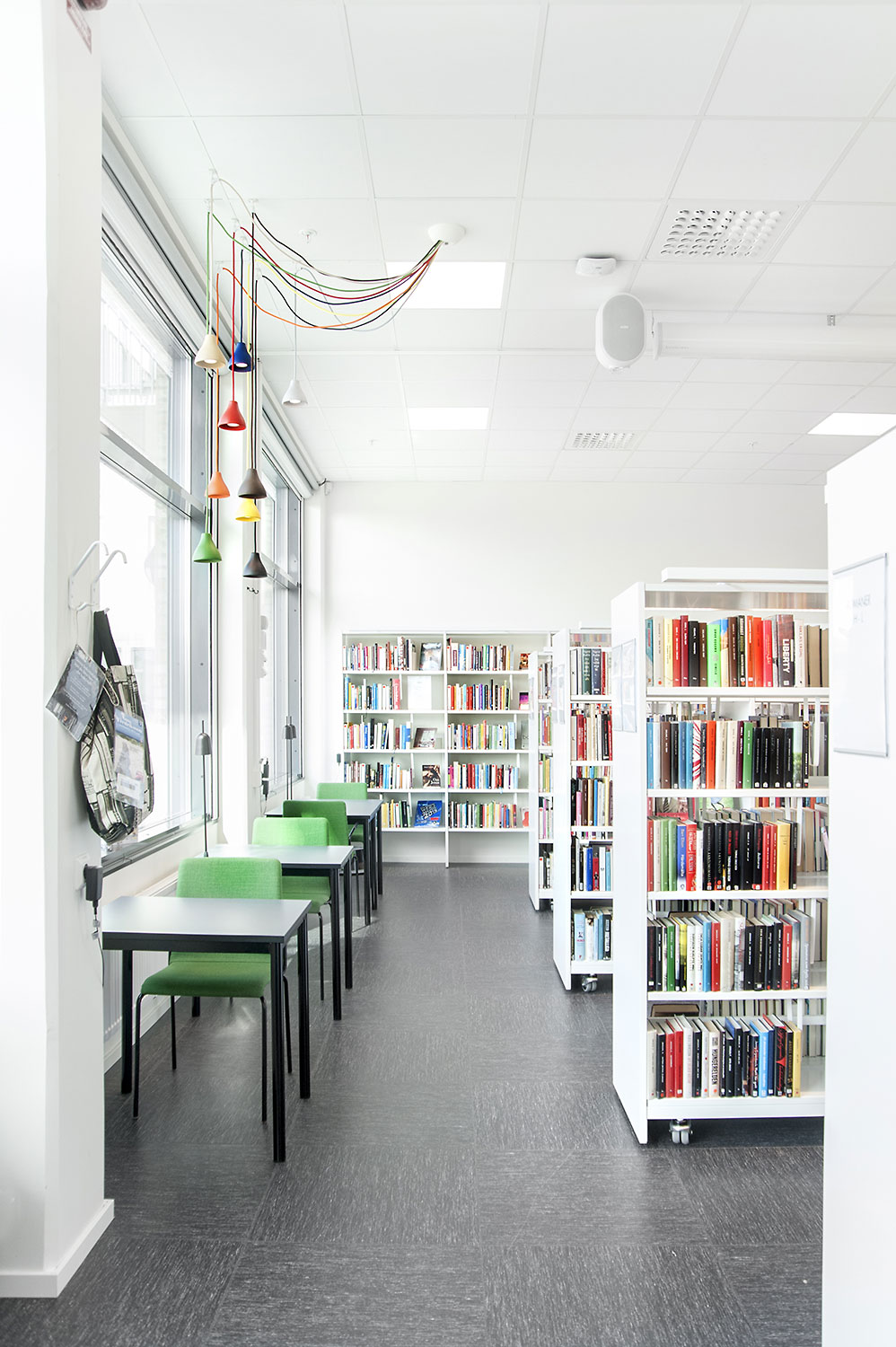De bibliotheek is ingericht met witte Frontline bibliotheekrekken die voorzien zijn van verschillende functies, zoals tijdschriftenopslag en displaylegborden. De rekken werden zo geplaatst dat het overal makkelijk toegankelijk is, ongeacht waar in de ruimte je bent.