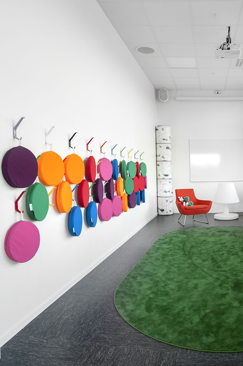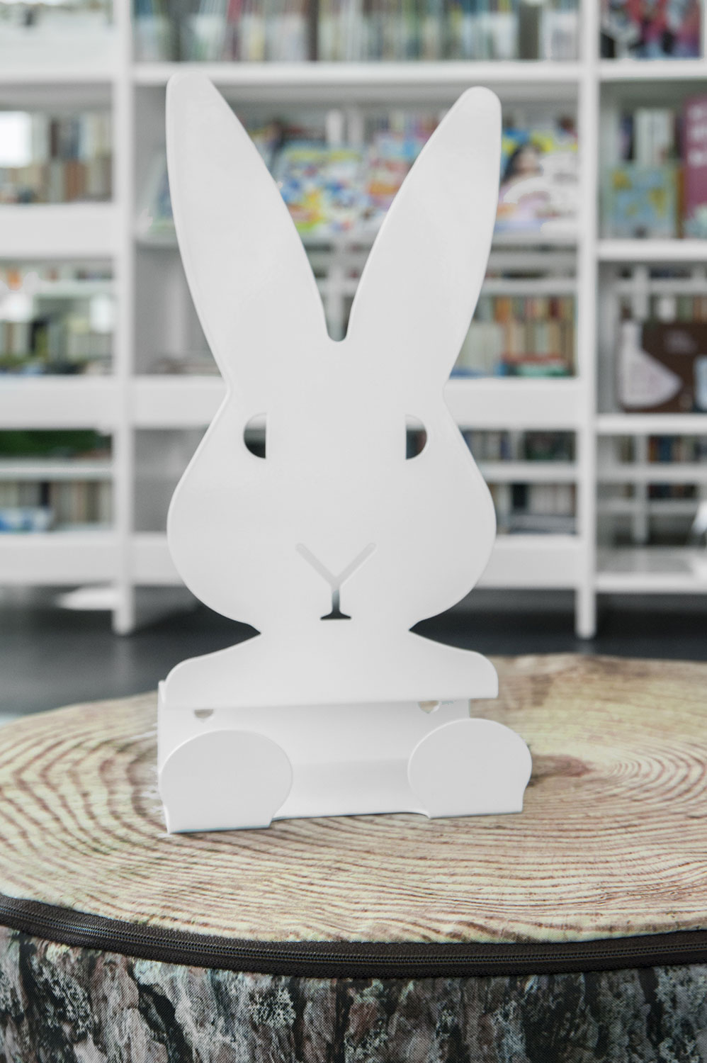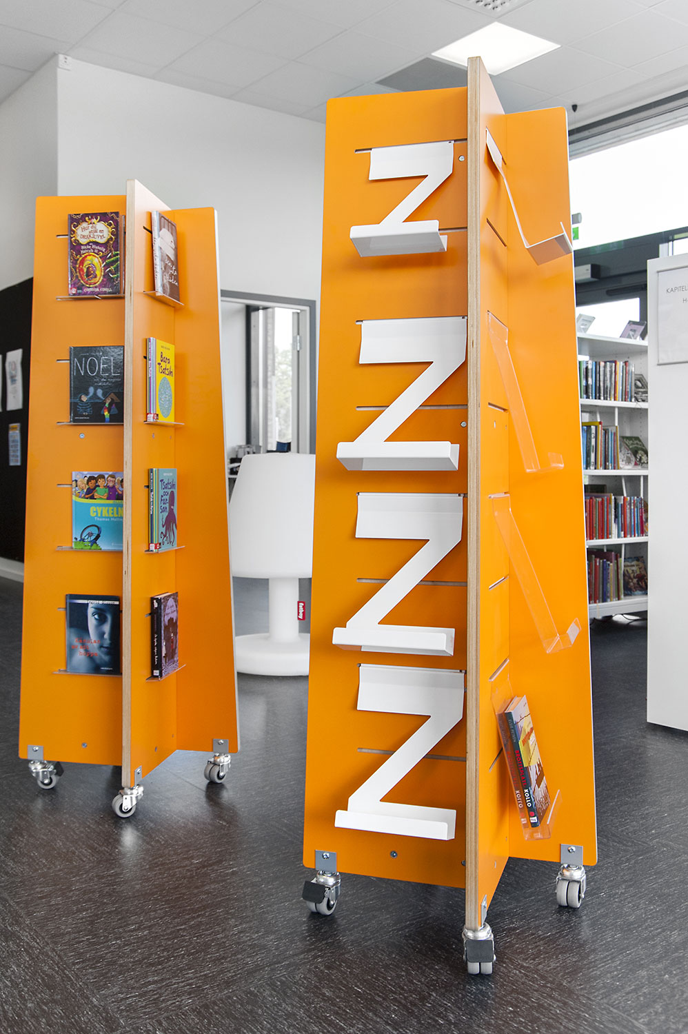 De bibliotheek is ingericht met witte Frontline bibliotheekrekken die voorzien zijn van verschillende functies, zoals tijdschriftenopslag en displaylegborden. De rekken werden zo geplaatst dat het overal makkelijk toegankelijk is, ongeacht waar in de ruimte je bent.