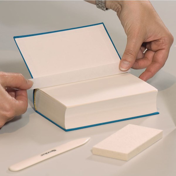 Ideaal voor het versterken van de naad tussen boekomslag en boeklichaam met een hoge hechtsterkte en sterke scheurweerstand. Het is nauwelijks zichtbaar en zeer flexibel, ideaal voor het verlijmen in de plooi, voor de bevestiging van prenten en foto’s in een passe-partouts of achter glas. Voor stofvrij afsluiten van kaders.