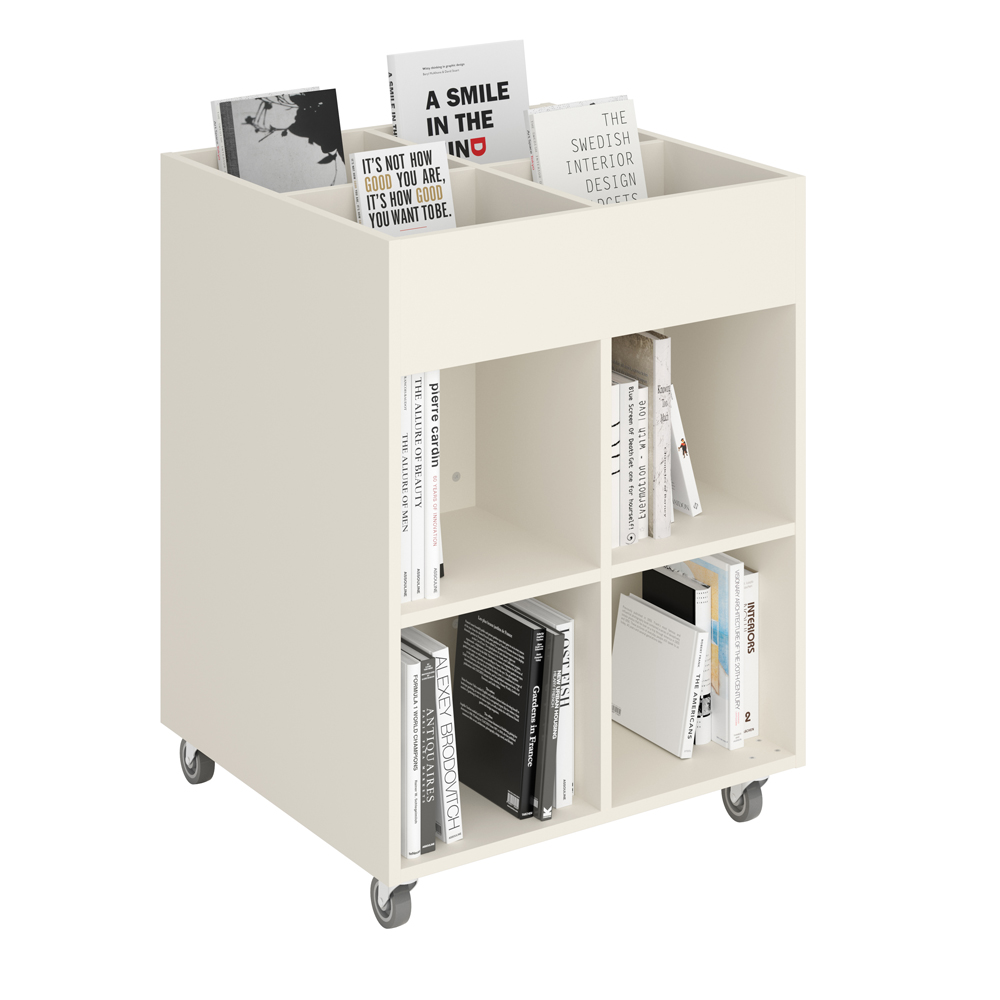 Sara Midi is een prentenboekenbak met vier displaycompartimenten bovenaan en vier opbergcompartimenten onderaan. Geschikt voor kinderen.