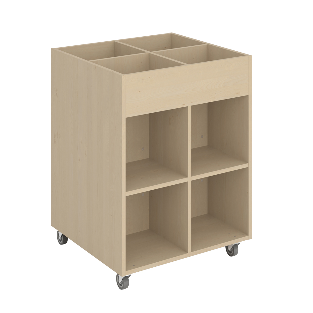 Sara Midi is een prentenboekenbak met vier displaycompartimenten bovenaan en vier opbergcompartimenten onderaan. Geschikt voor kinderen.