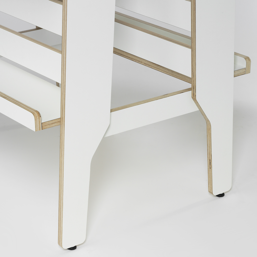 We gebruiken gelamineerd berkenmultiplex - hier met zichtbare randen - om zowel een duurzaam oppervlak als een duurzame constructie te creëren. Perfect voor de meest veeleisende bibliotheekomgevingen!