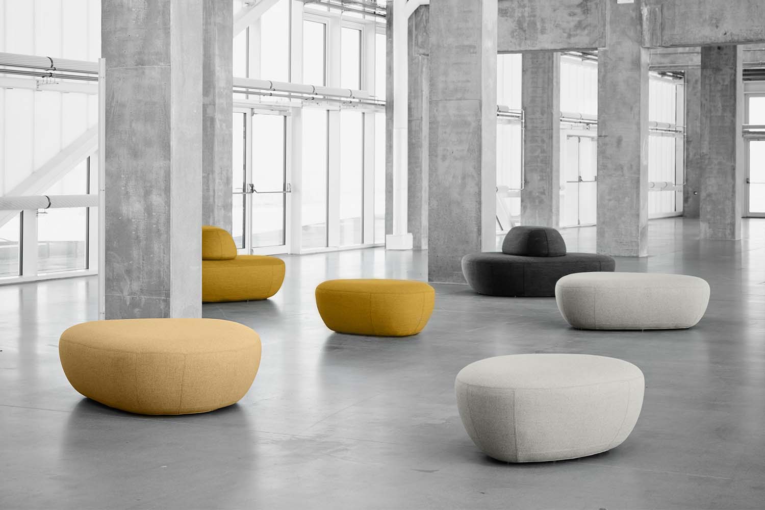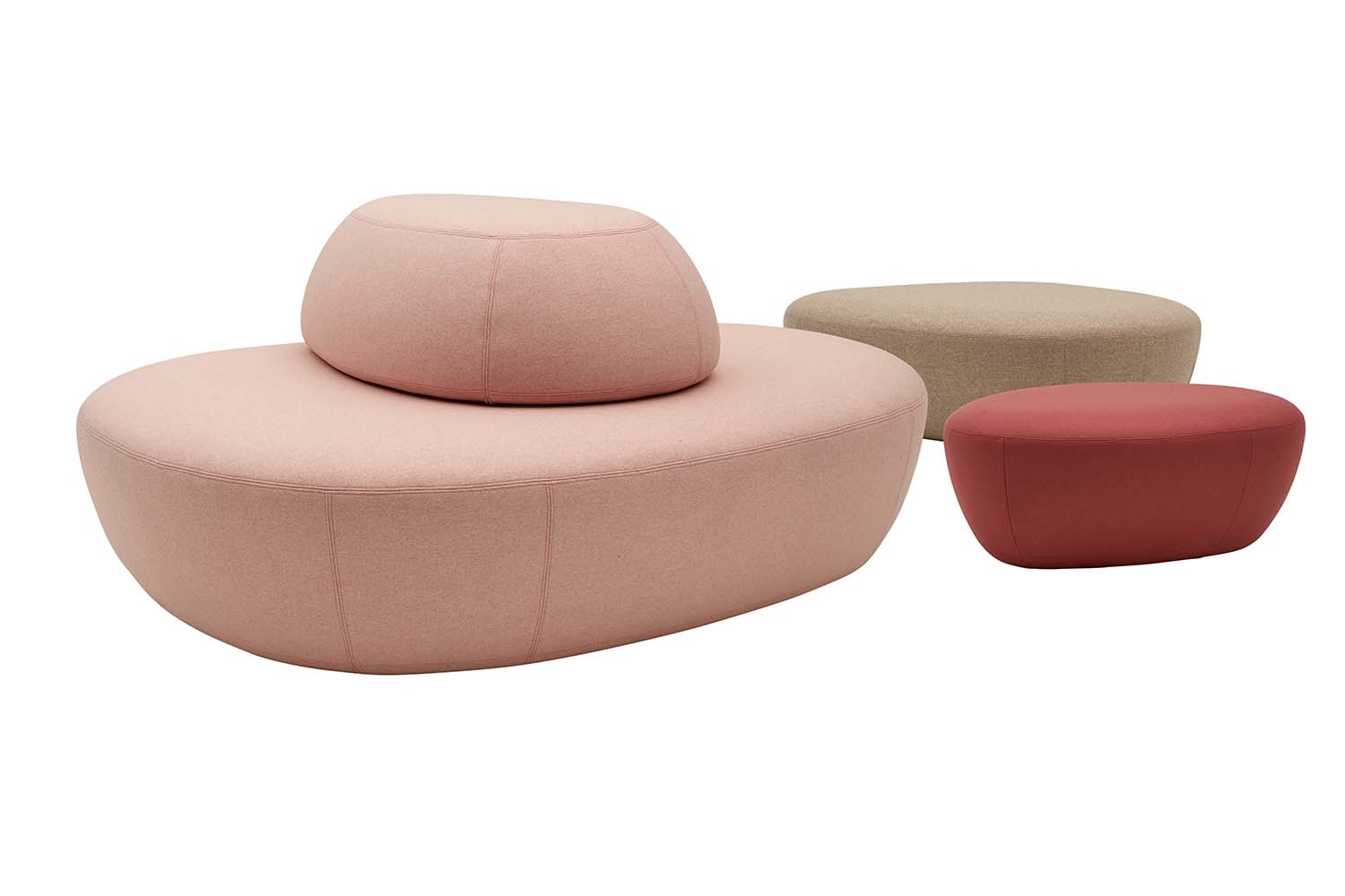 Het zitmeubilair en de poefs zijn zacht en licht en kunnen met elkaar worden gecombineerd of op zichzelf staan.