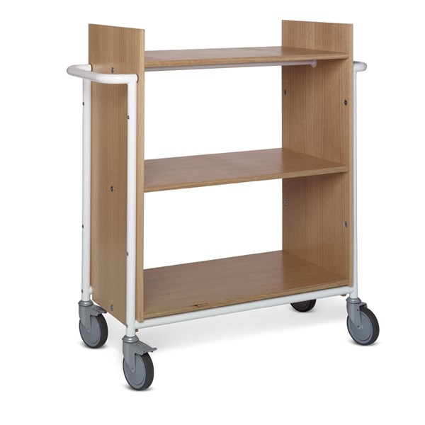 Dubbelzijdige boekenwagen met drie, veel plaats biedende, vlakke legborden.