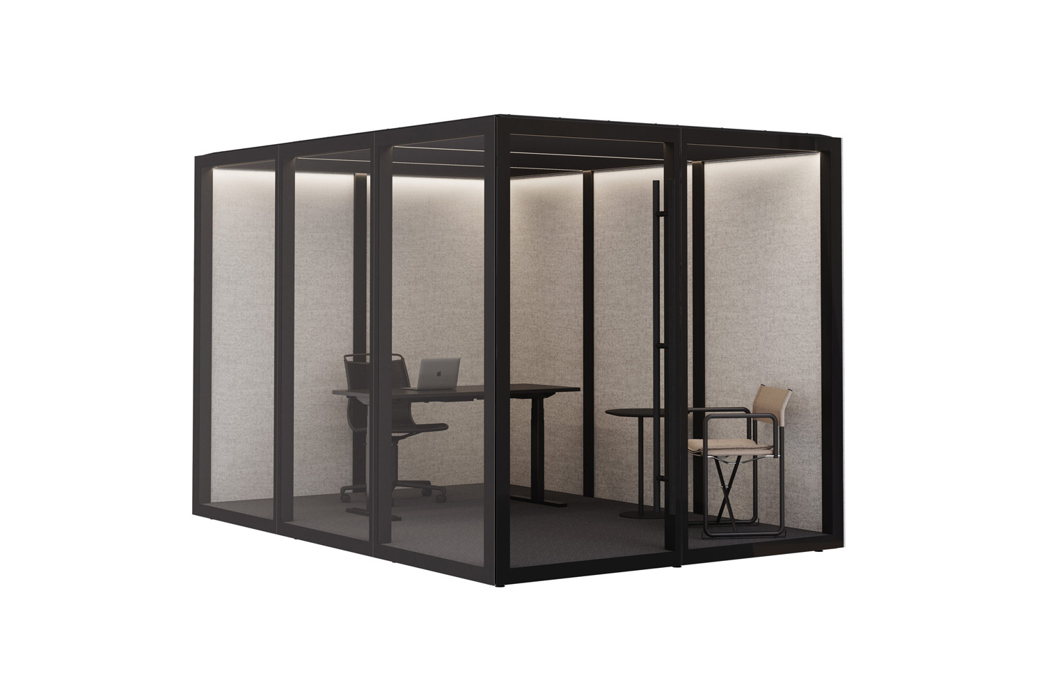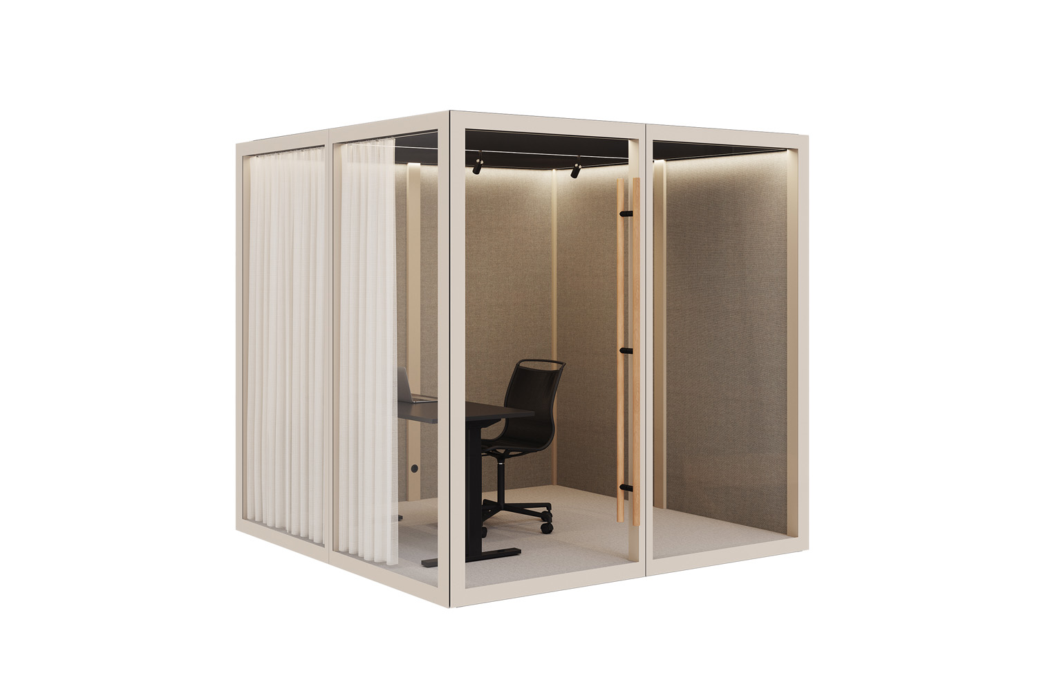 Zen Pod® combineert geavanceerde geluidsabsorberende technologie met een elegant ontwerp. Twee wanden zijn voorzien van akoestisch glas, terwijl de overige wanden geluidsabsorberend zijn en zowel aan de binnen- als buitenzijde bekleed zijn met textiel. Het plafond biedt ook geluidsisolatie met aangename verlichting.